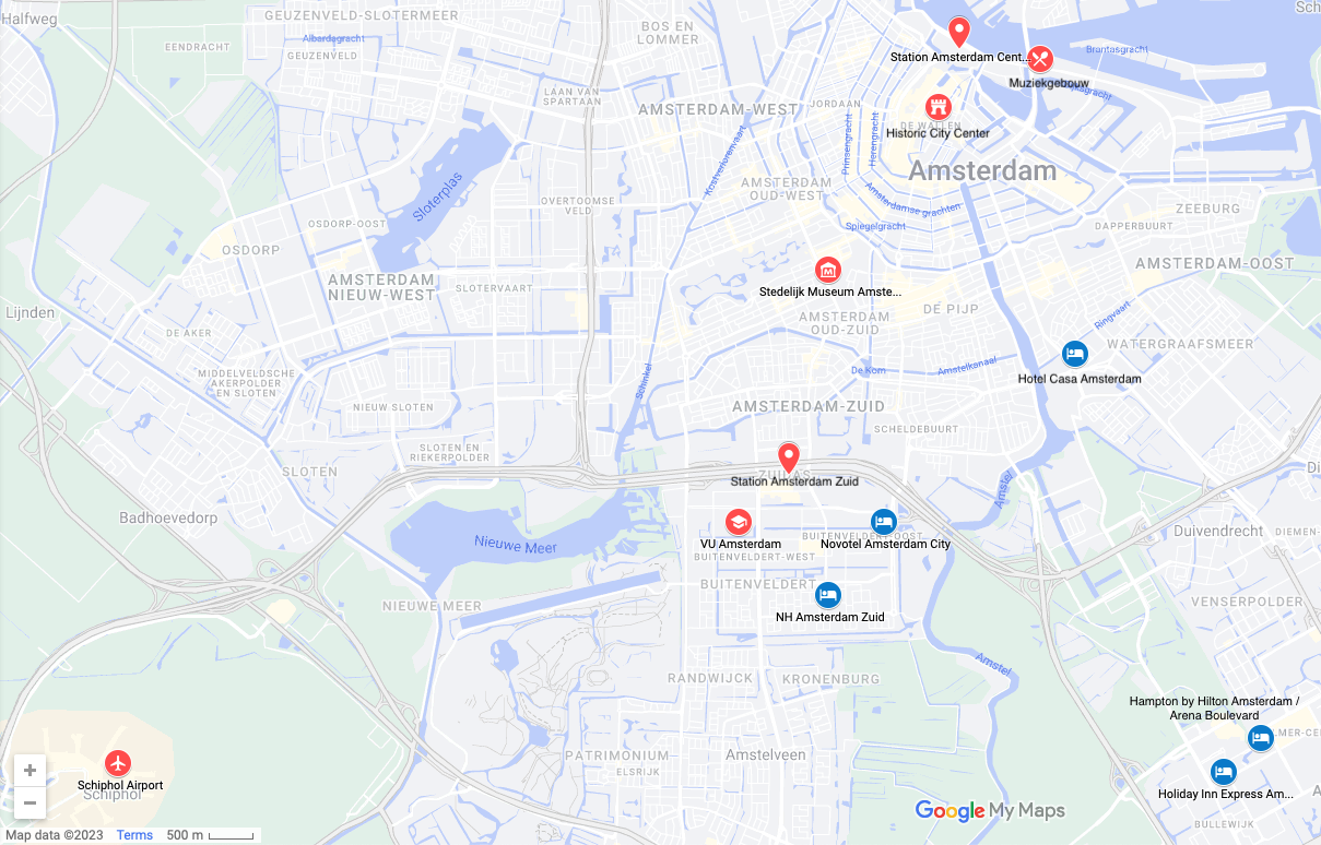 For your convenience, we provide a list of the main venues and hotels below, with links to Google Maps. The venues are also indicated on a map of Amsterdam to give you a sense of direction.