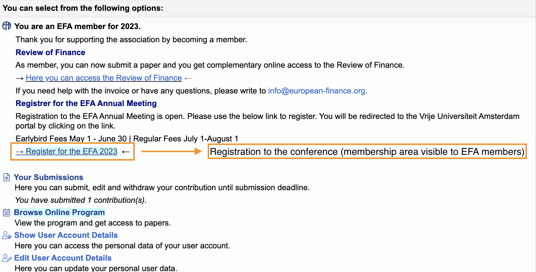 Registration for the European Finance Assocation (EFA) 2023 Annual Meeting is closed. To register, one needs to be a member of the EFA. To become a member, visit this page. EFA members have a private ConfTool account, through which they can register for EFA 2023. The link is visible when the registration is open, after logging into one’s EFA ConfTool account (see here for a clarifying screenshot).